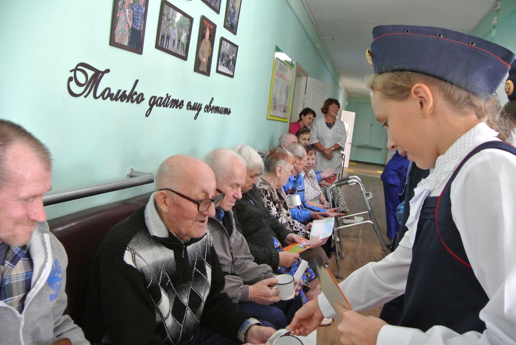 Представителями православной школы в этот день были учащиеся 5 класса. Они поздравили насельников дома милосердия с праздником Рождества Пресвятой Богородицы небольшим концертом, вручили сувениры и подарки сделанные учащимися 1-4 классов, а также передали дары от прихожан Московского храма в честь иконы Божией Матери Тихвинская.